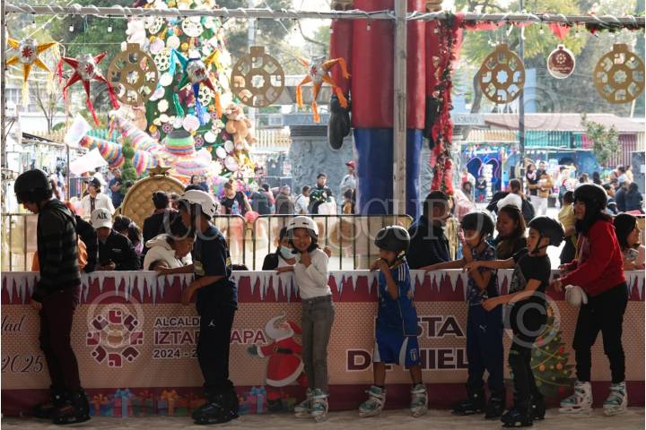 CIUDAD DE MÉXICO, 21DICIEMBRE2024.- Jóvenes y niños acudieron a disfrutar de la pista de hielo instalada en la Macroplaza de la alcaldía Iztapalapa. FOTO: GRACIELA LÓPEZ/CUARTOSCURO.COM