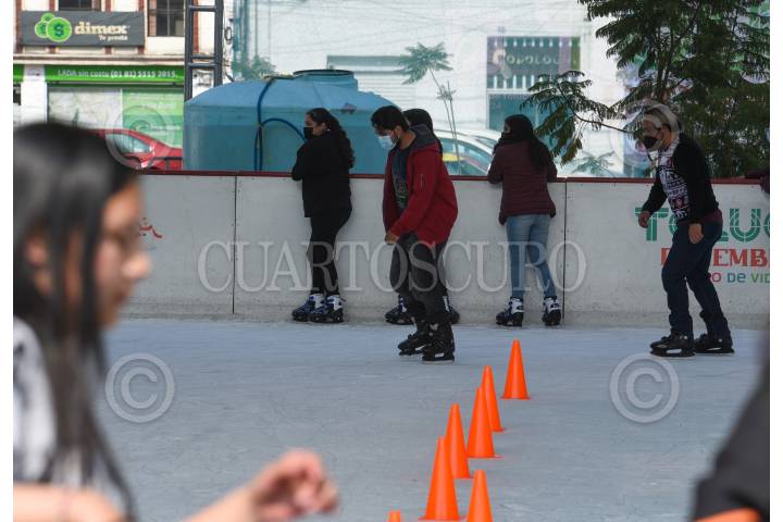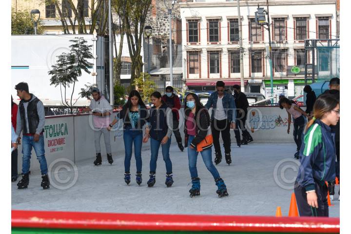 Jóvenes disfrutan de la pista de hielo instalada en la capital mexiquense.
