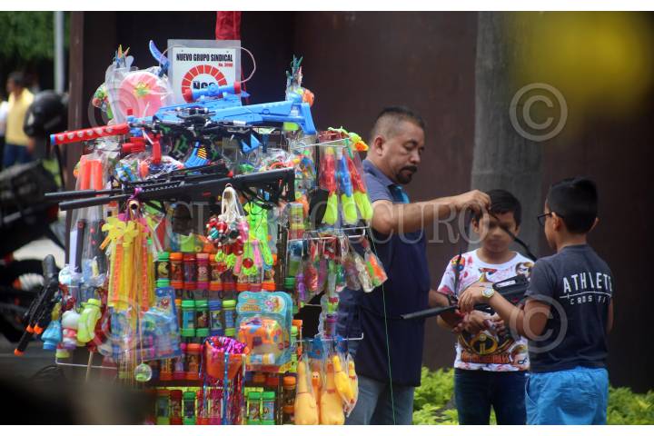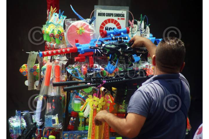 CUERNAVACA, MORELOS, 16JUNIO2019. Un comerciante informal adherido al Nuevo Grupo Sindical vende juguetes, entre ellos algunos bélicos como pistolas y rifles. Se instala en el zócalo de la ciudad, frente al Palacio de Gobierno. FOTO: MARGARITO PÉREZ RETANA /CUARTOSCURO.COM