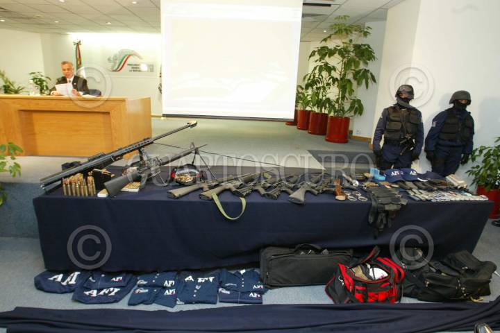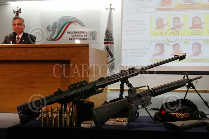 México, D.F. 24 JUNIO 2004.- A los integrantes del Cártel de los Arellano Félix les decomisaron armas de alto poder como una ametralladora tipo Barrett, .50 milímetros, así como fusiles A-R15, utilizados por el Ejército Mexicano, pistolas, teléfonos celulares y vehículos. FOTO: Jarge Alvarado/CUARTOSCURO.COM