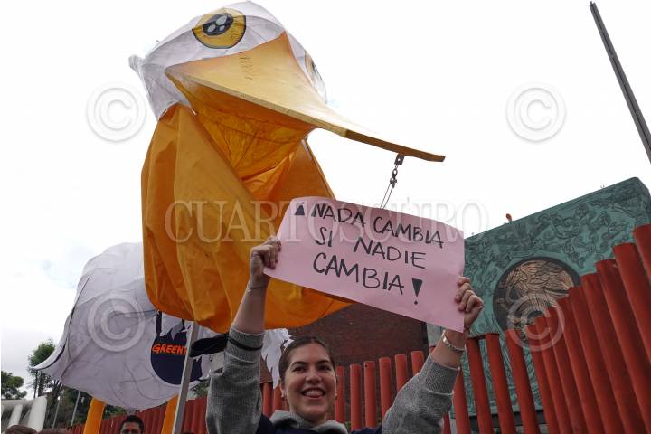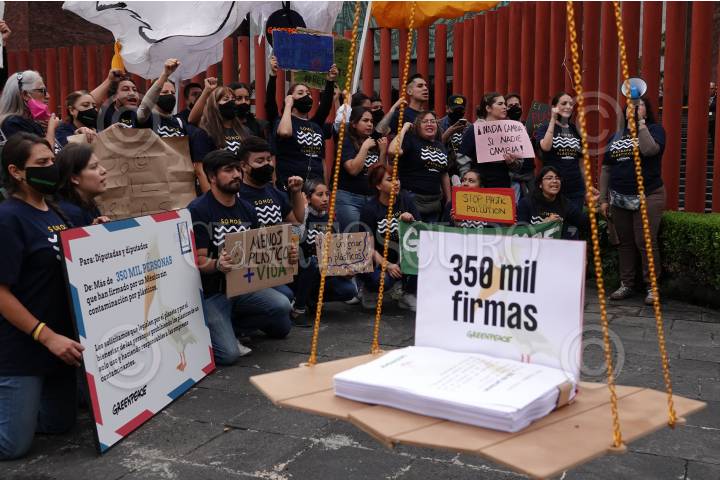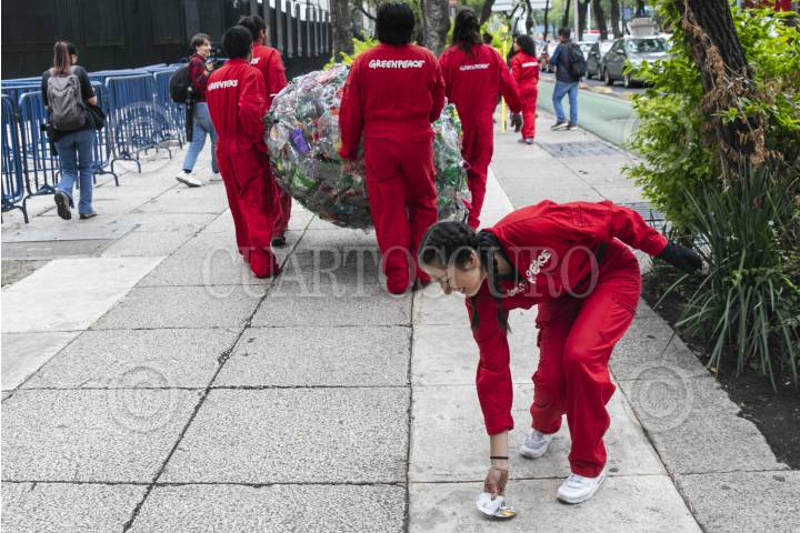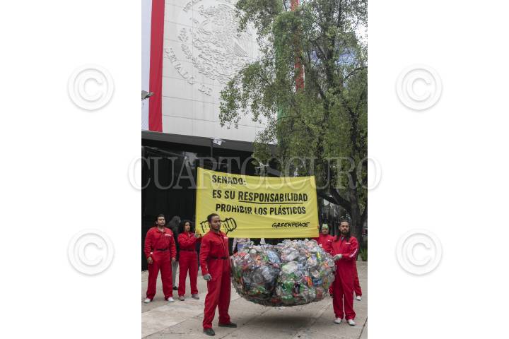 CIUDAD DE MÉXICO, 24SEPTIEMBRE2024.- Un amparo interpuesto en el 2022 por Greenpeace México, El Poder del Consumidor y la Red Mexicana de Acción Ecológica fue concedido por Tribunal Colegiado el cual obliga al Congreso de Unión a legislar para prohibir la comercialización y empleo de plásticos de un uso uso, esto debido al impacto negativo que tienen en la salud de las personas y en el medio ambiente, debido a las sustancias tóxicas que se desprenden de ellos. Es por eso que hoy integrantes de Greenpeace acudieron a la sede del Senado para desplegar una manta con la leyenda "Senado: es su responsabilidad prohibir los plásticos" para presionar a sus integrantes y comiencen los trabajos en el sentido de la resolución del amparo. FOTO: MOISÉS PABLO/CUARTOSCURO.COM