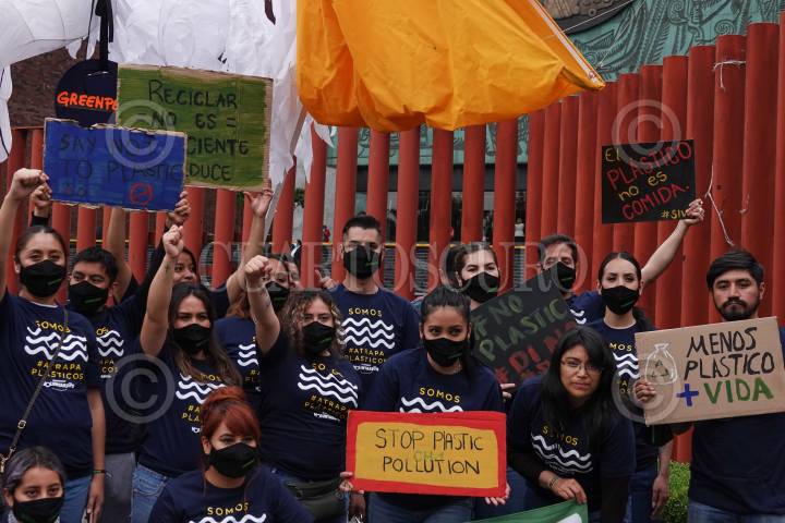 Integrantes de Greenpeace protestaron para exigir la prohibición de plásticos de un solo uso afuera de la Cámara de Diputados