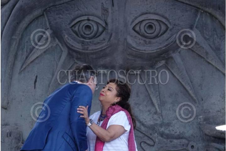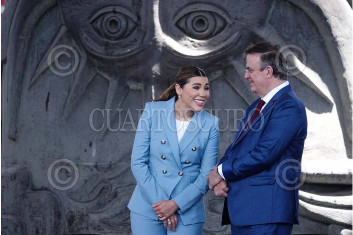CIUDAD DE MÉXICO, 03ABRIL2025.- Marcelo Ebrard, secretario de Economía y Clara Brugada, jefa de Gobierno, se saludaron durante su llegada a la presentación de la continuación del Plan México. Fortaleciendo la Economía y el Bienestar encabezado por la presidenta Claudia Sheinbaum en el Museo de Antropología e Historia. FOTO: GRACIELA LÓPEZ/CUARTOSCURO.COM