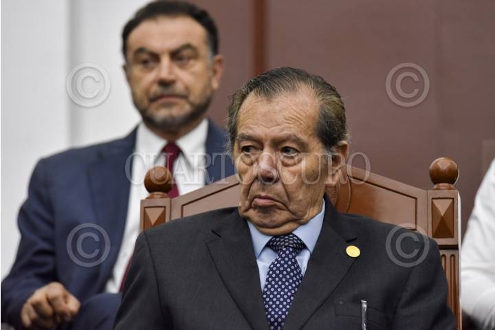 TOLUCA, ESTADO DE MÉXICO, 20JUNIO2019.- Porfirio Muñoz Ledo, Presidente de la Mesa Directiva de la Cámara de Diputados federal, el diputado Oscar González y Alfredo Barrera Baca, rector de la UAEM, durante el cuarto y último Foro Regional para analizar el Plan Nacional de Desarrollo 2019-2024. FOTO: CRISANTA ESPINOSA AGUILAR /CUARTOSCURO.COM