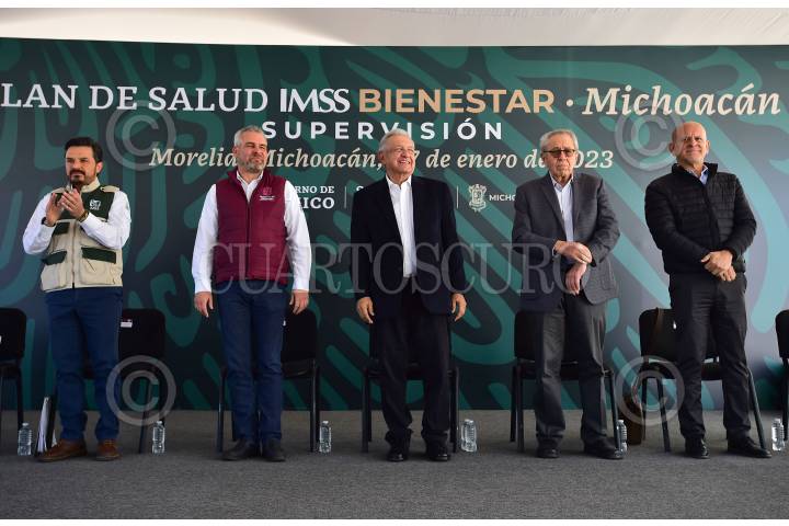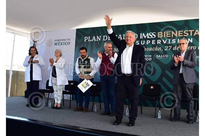 Andrés Manuel López Obrador, presidente de México, durante el evento protocolario del Plan Nacional de Salud IMSS-Bienestar en Michoacán, en el Hospital IMSS-Bienestar “Eva Sámano”. Lo acompañaron: Silvia Chávez Gallegos, directora del Hospital IMSS-Bienestar “Eva Sámano”; Gisela Lara Saldaña, directora general de los Servicios de Salud del Instituto Mexicano del Seguro Social para el Bienestar (IMSS-BIENESTAR); Zoé Robledo Aburto, director general del Instituto Mexicano del Seguro Social; Alfredo Ramírez Bedolla, gobernador Constitucional del Estado de Michoacán; Jorge Alcocer Varela, secretario de Salud; Juan Antonio Ferrer Aguilar, director general del Instituto de Salud para el Bienestar y Juan Pablo de Botton Falcón, subsecretario de Egresos de la Secretaría de Hacienda y Crédito Público.