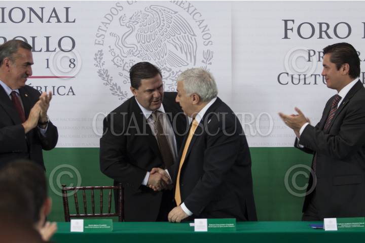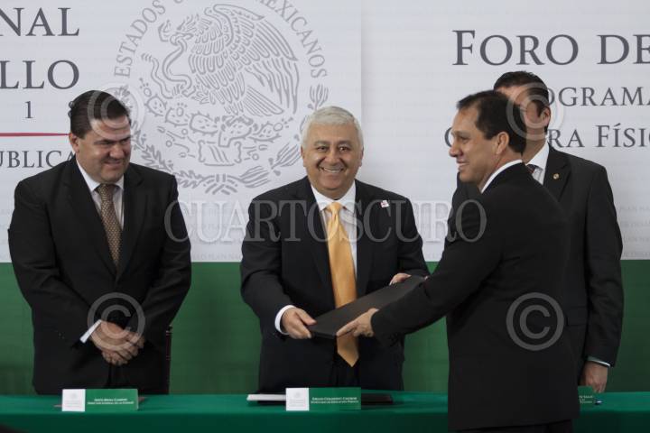 MÉXICO, D.F., 11ABRIL2013.- Jesús Mena Campos, director de la CONADE y Emilio Chuayffet, secretario de Educación Pública durante los Foros de Consulta Ciudadana, en el marco de la elaboración del Plan Nacional de Desarrollo 2013-2018 con el foro “Cultura Física y Deporte” que se realizó en la Secretaria de Educación Pública. FOTO: RODOLFO ANGULO /CUARTOSCURO.COM