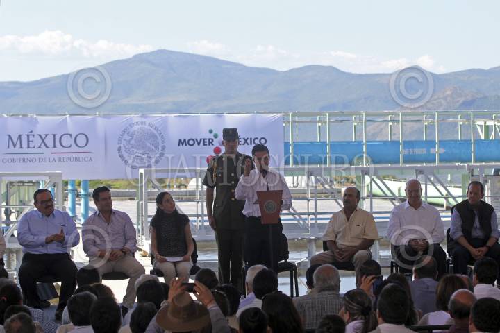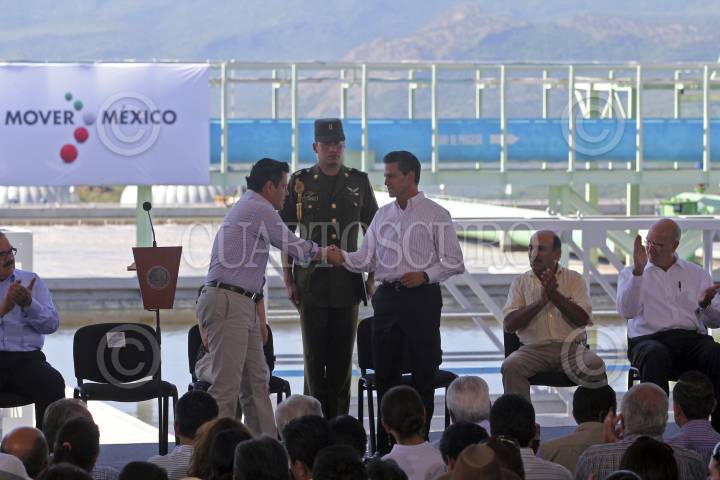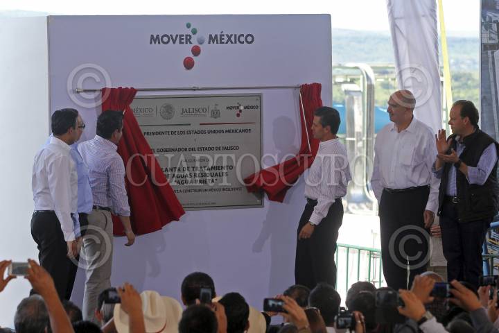 Zapopan, Jalisco. 22JULIO2014.- Jorge Aristoteles Sandoval, gobernador del estado y Enrique Peña Nieto, Presidente de México, durante la inauguración de la planta de tratamiento de aguas residuales de Agua Prieta, por el momento la mas grande de México y misma que permitirá el saneamiento del 80 por ciento de las aguas negras en beneficio de mas de 3 millones 250 mil habitantes de los municipios de Guadalajara, Zapopan, Tonalá y Tlaquepaque. FOTO: FERNANDO CARRANZA GARCIA /CUARTOSCURO.COM