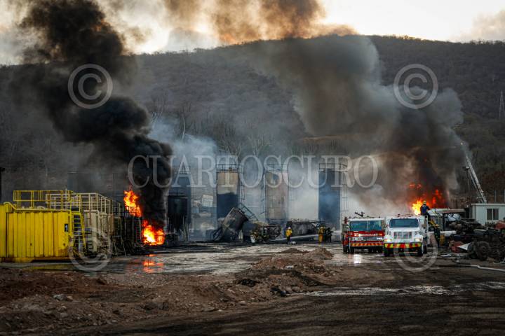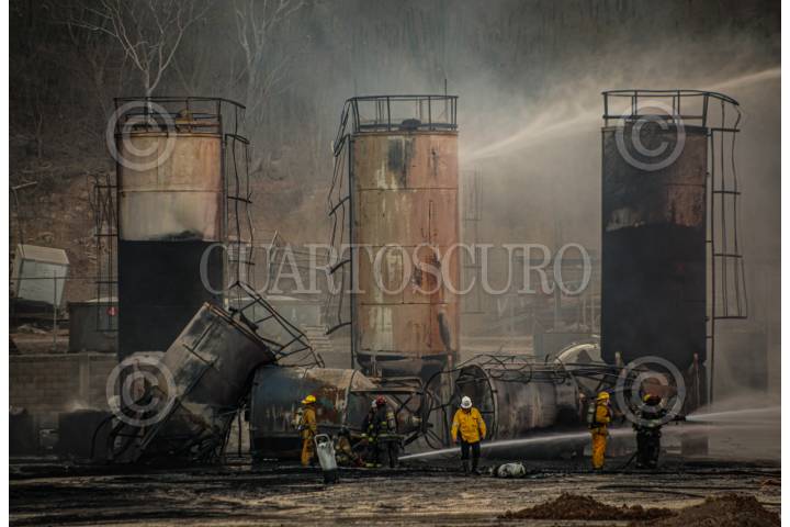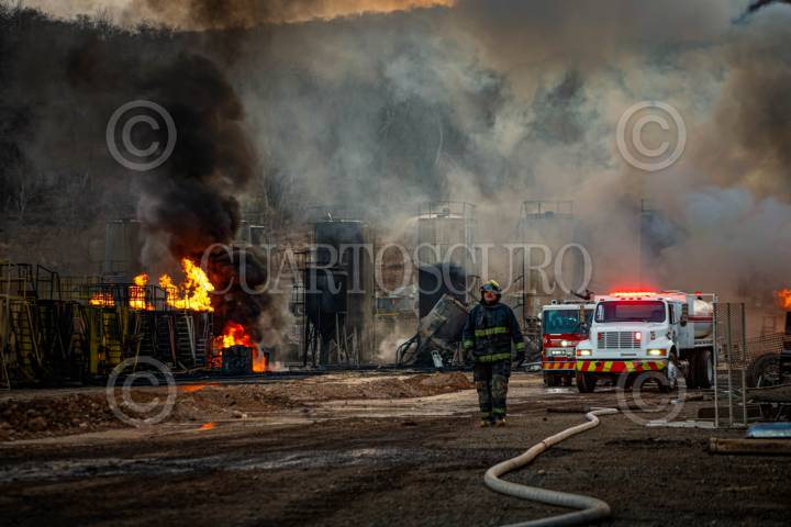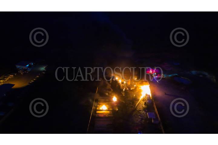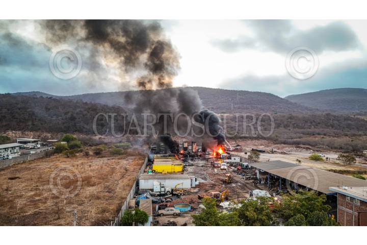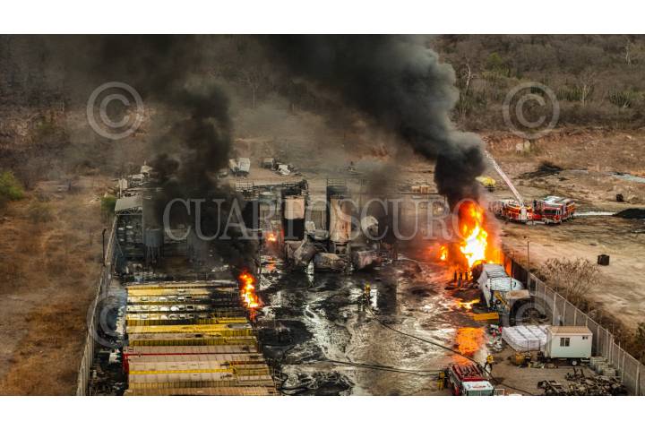 CULIACÁN, SINALOA, 03ABRIL2025.- Durante la madrugada de este jueves 3 de abril, un incendio de origen desconocido consumió una planta procesadora de diésel ubicada en una yarda al sur de Culiacán, provocando la movilización de distintas corporaciones de emergencia. El siniestro, reportado al 911 alrededor de las 2:00 a. m., fue atendido inicialmente por Bomberos Veteranos Culiacán, quienes, al percatarse de la magnitud del fuego, solicitaron apoyo. Al sitio llegaron Bomberos Culiacán, Protección Civil municipal y estatal, así como paramédicos de la Cruz Roja y voluntarios de Aguaruto. Debido a la presencia de material altamente inflamable, las llamas se propagaron rápidamente a otras áreas del establecimiento, obligando a las autoridades a desplegar varias pipas con miles de litros de agua para sofocar el fuego. FOTO: JOSÉ BETANZOS ZÁRATE/CUARTOSCURO.COM
