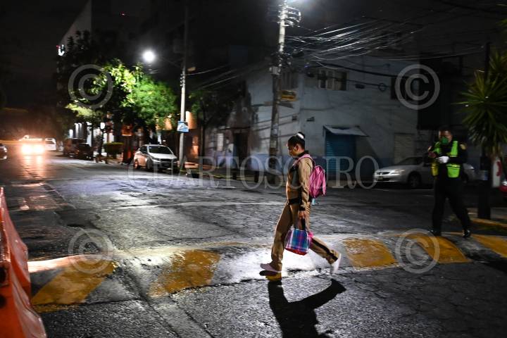 Una estudiante cruza la calle para llegar a su plantel.