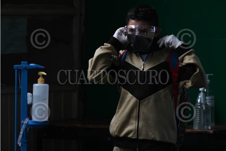 Un estudiante protegido con careta, cubrebocas y guantes, ingresa de nueva cuenta al plantel después de más de un año.