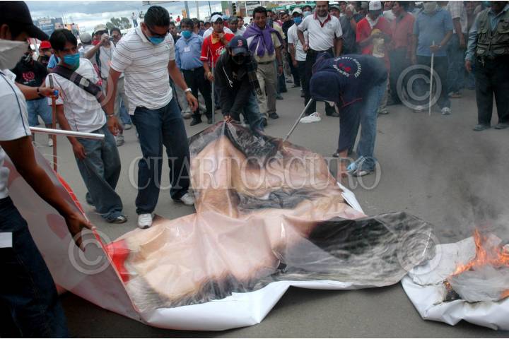OAXACA, OAXACA, 23JUNIO2006.- Maestros del SNTE que permanencen en platón en el Zócalo desde hace varios días y cuya principal demanda es la destitución del gobernador Ulises Ruíz, acompañados por alumnos del nivel medio superior y simpatizantes bloqueron el cruce vehicular conocido como Cinco Señores, ahí quemaron y destruyeron propaganda del candidato presidencial de Alianza por México, el tabasqueño Madrazo. FOTO: Moisés Pablo/CUARTOSCURO.COM