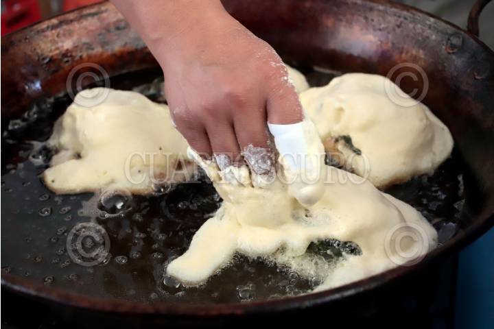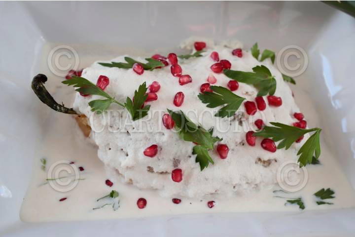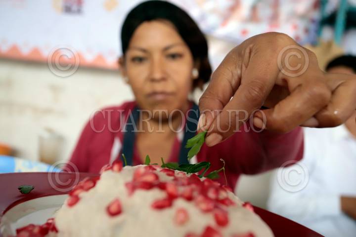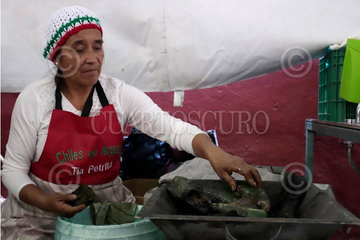 Cocineras elaboran Chiles en Nogada para la feria que se lleva a cabo en San Andrés Calpan, municipio ubicado en la zona del Izta-Popo, región donde se cultivan los ingredientes de dicho platillo.