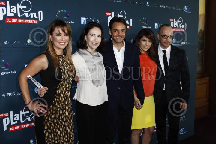 MÉXICO, D.F., 12MARZO2014.- La presentadora Aurora Valle, la actriz Blanca Guerra, el actor Eugenio Derbez, la actriz y cantante Alejandra Rosaldo y el presentador Juan Carlos Arciniegas durante la presentación de los Premios Platino del Cine Iberoamericano que se realizará en próximo 3 de abril en Panama. FOTO: RODOLFO ANGULO /CUARTOSCURO.COM