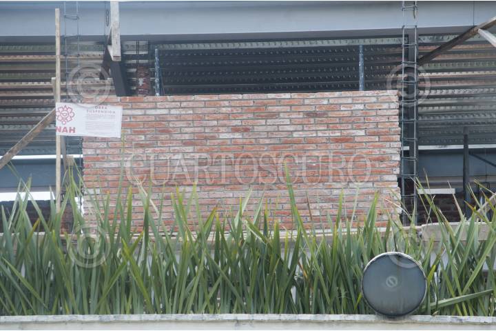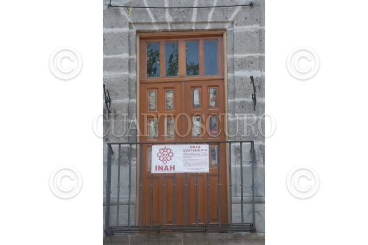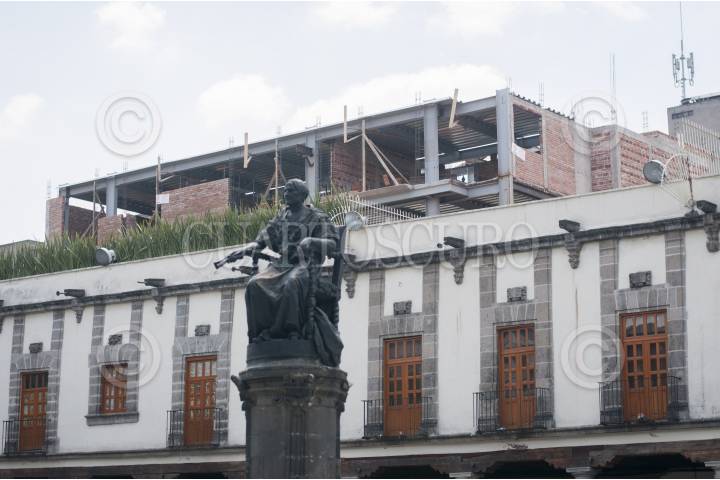 MÉXICO, D.F., 29AGOSTO2014.- Sobre el edificio de los Portales que se encuentra en la Plaza de Santo Domingo fue construida una estructura de hierro y tabique rojo, misma que fue clausurada con sellos del Instituto Nacional de Antropología e Historia (INAH), por violar la Ley Federal sobre Monumentos y zonas arqueológicas, artísticos e históricos. FOTO: DIEGO SIMÓN SÁNCHEZ /CUARTOSCURO.COM