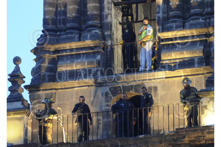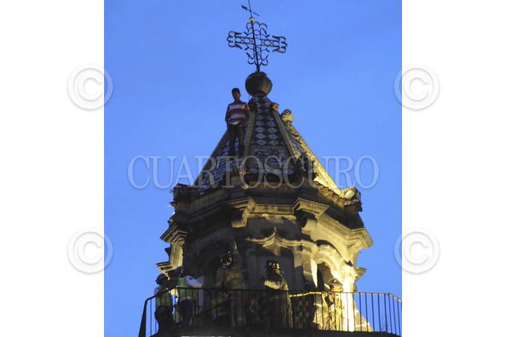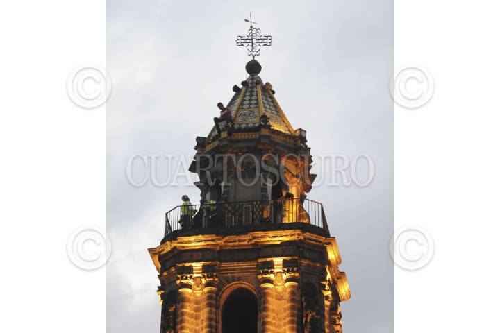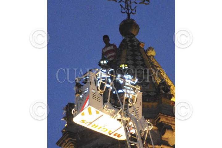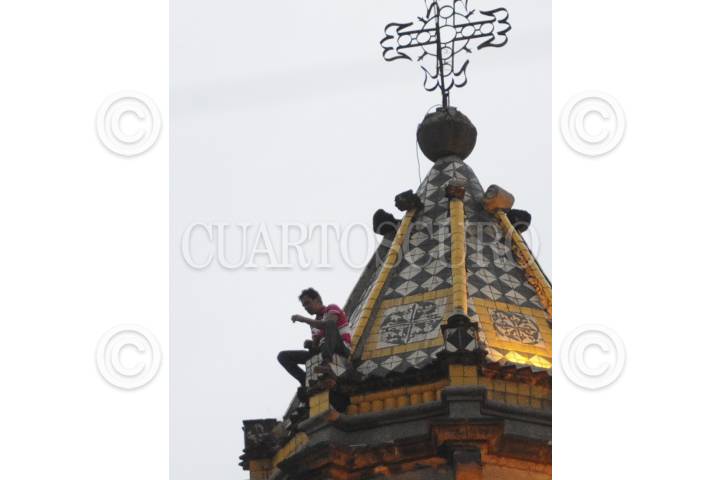 CIUDAD DE MÉXICO, 12ABRIL2017.- Un hombre se trepo en la cúpula más alta de la Iglesia de Santo Domingo amenazando con aventarse al vacío, personal de los Servicios de Emergencia lograron que el suicida se persuadiera de no hacerlo. Los hechos en la calle de Brasil y Venezuela, en el Centro Histórico. FOTO: MOISÉS PABLO /CUARTOSCURO.COM