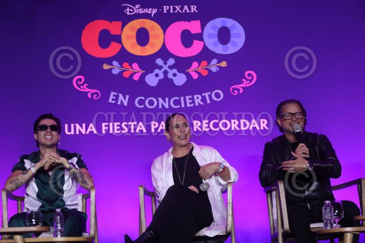 CIUDAD DE MÉXICO, 09OCTUBRE2024. Mario Bautista, Angélica Vale y Chacho Gaytán durante la conferencia del espectáculo “Coco en concierto: Una fiesta para recordar”, que se llevará a cabo el próximo 2 de noviembre en la Plaza de Toros La México. FOTO: EDGAR NEGRETE LIRA/CUARTOSCURO.COM