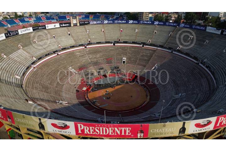 CIUDAD DE MÉXICO, 07NOVIEMBRE2024.- Luego del cierre total por parte de Protección Civil con sellos precautorios en la Plaza de Toros y el Estadio Ciudad de los Deportes y después de una reunión con autoridades, en la que también se involucraron vecinos de la zona, se informó que ambos recintos volverán a abrir sus puerta al público bajo los protocolos y medidas que de acordaron. En imagen toma aerea de la Plaza de Toros. FOTO: ROGELIO MORALES /CUARTOSCURO.COM