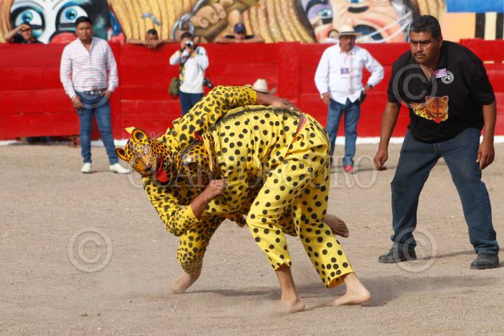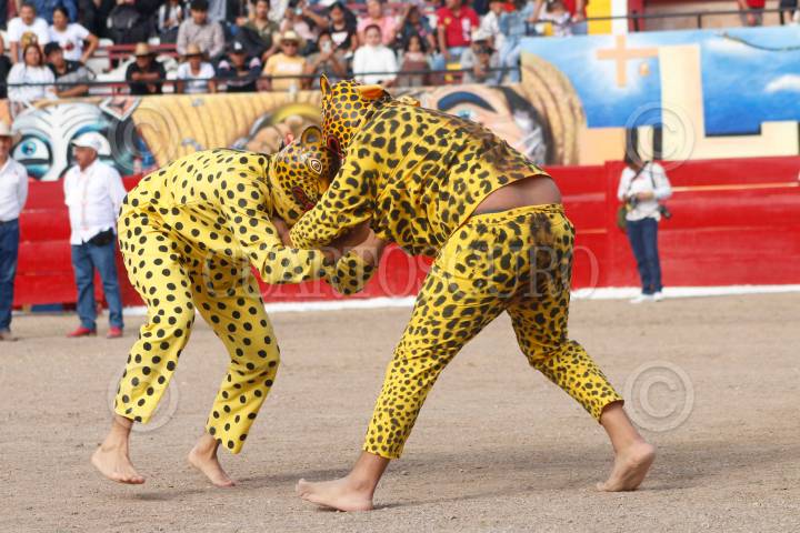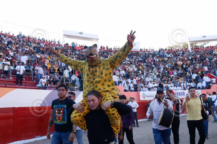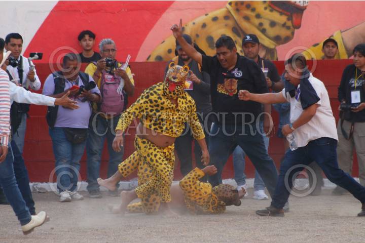CHILPANCINGO, GUERRERO, 22DICIEMBRE2024.- Después de una descalificación del tigre del barrio de Tequicorral, el representante del barrio de San Mateo se convierte en el bicampeón del porrazo de tigres 2024. Cómo es tradición, después del tradicional Paseo del Pendón, se llevó a cabo el porrazo de tigres, en el interior de la plaza de toros "Belisario Arteaga". FOTO: DASSAEV TÉLLEZ ADAME/CUARTOSCURO.COM