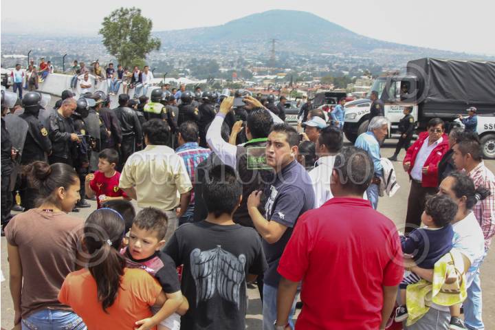 LOS REYES LA PAZ, 24JULIO2014.- Habitantes de los Reyes la Paz intentaron dar portazo durante la inauguración del mega proyecto deportivo Soraya Jiménez, Plaza Estado de México, después que elementos de seguridad y personal de logística les negaron el acceso. Granaderos del Edomex asistieron al lugar para para resguardar los acceso al deportivo. FOTO: SAUL LOPEZ /CUARTOSCURO.COM