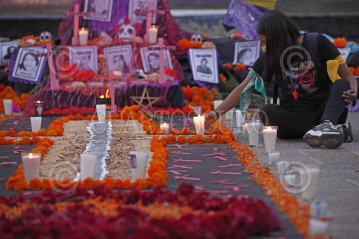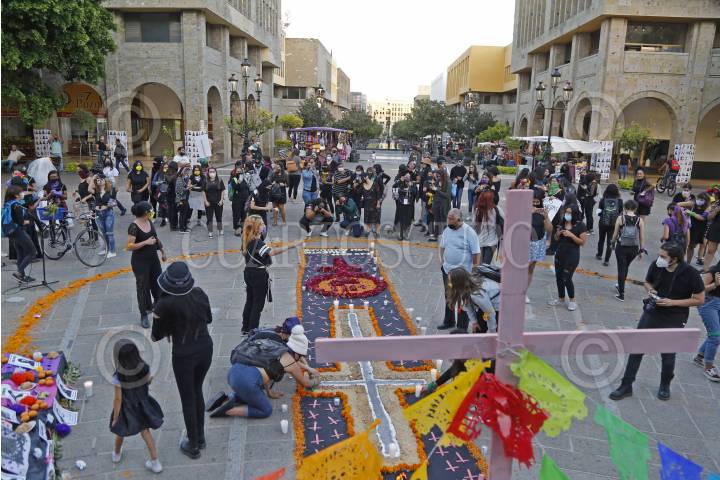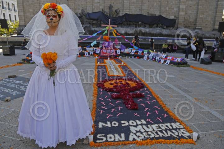 Feministas vestidas de catrinas realizaron una protesta en Plaza Fundadores para honrar a las mujeres asesinadas en México.