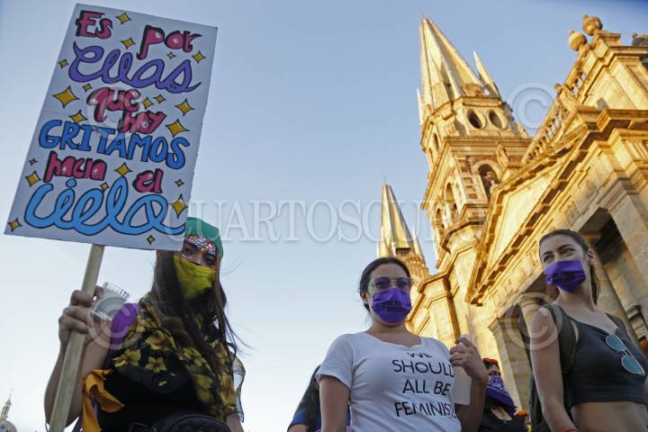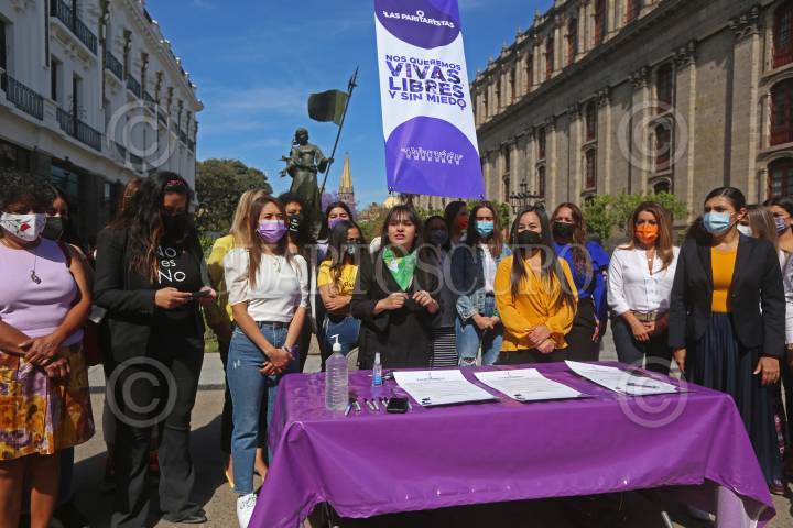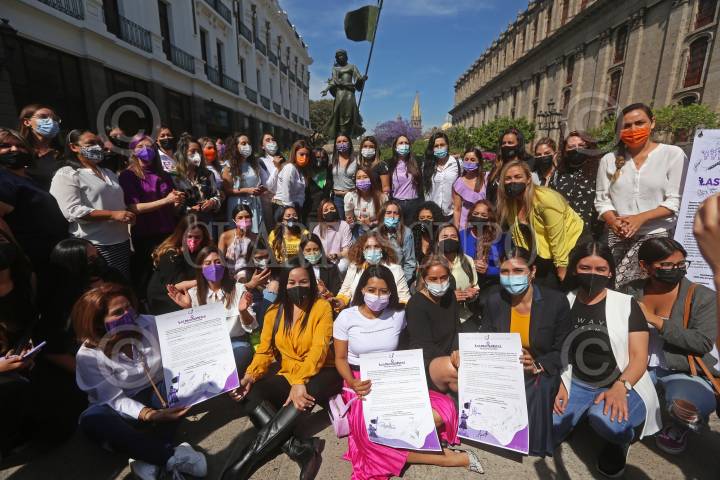 Fotografía general de las integrantes del movimiento de las Paritaristas, posterior a la firma del acuerdo por la solidaridad que se llevo a cabo en la explanada de la Plaza Fundadores, en el centro de Guadalajara.