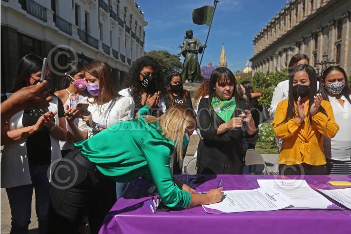 Una mujer que pertenece al movimiento de las Paritaristas y candidata de un un partido político a un puesto de elección popular, firma el acuerdo por la solidaridad, esto en la explanada de la Plaza Fundadores, en el centro de Guadalajara.