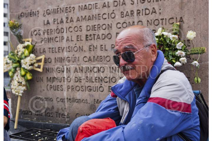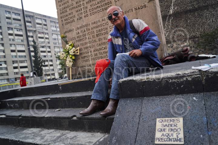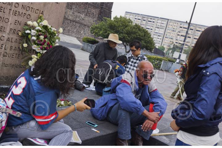 MÉXICO, D.F., 01OCTUBRE2012.- Carlos Antonio Bernal Maziel, ex estudiante sobreviviente a la matanza estudiantil del 2 de Octubre de 1968, platica con jóvenes en la Plaza de las Tres Culturas y les narra lo ocurrido aquella lejana tarde. FOTO: PEDRO ANZA /CUARTOSCURO.COM