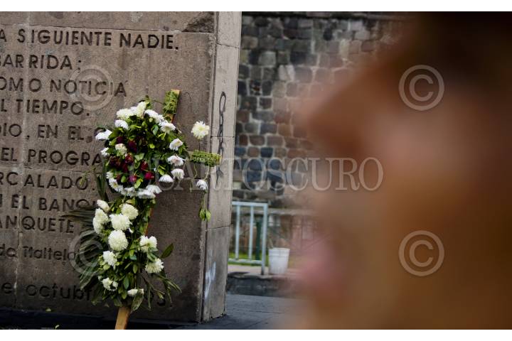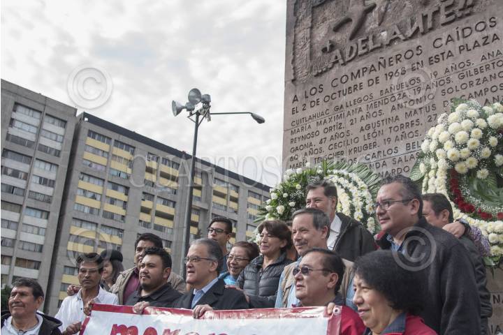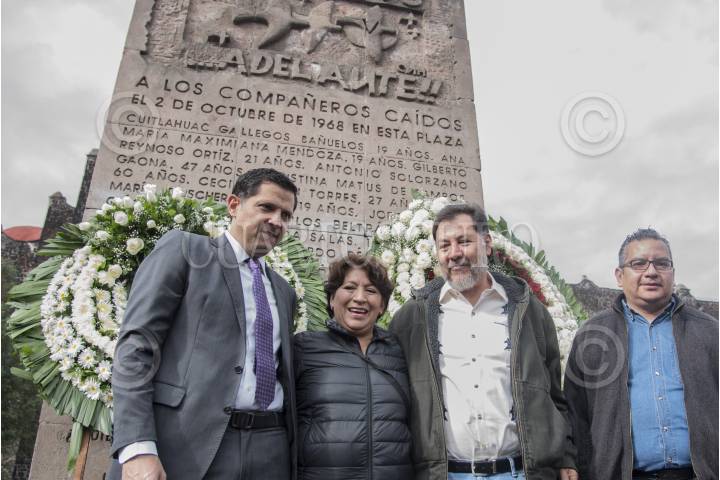 CIUDAD DE MÉXICO, 26JULIO2017.- La maestra Delfina Gómez, ex candidata a la gubernatura de Estado de México por Morena, y el político Gerardo Fernández Noroña, encabezaron la colación de una ofrenda en el Monumento a las víctimas de la Matanza de Tlatelolco del 2 de octubre de 1968, ubicado en la Plaza de las Tres Culturas, en el marco de las actividades que comprenden la Marcha por la Esperanza. FOTO: MARIO JASSO /CUARTOSCURO.COM