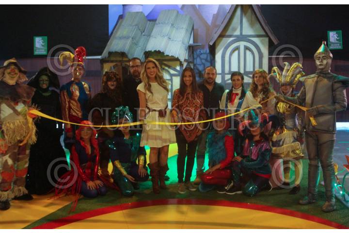 La conductora Raquel Bigorra y la actriz Sandra Cervantes, acompañadas de actores del elenco del Mago de Oz durante el corte de listón precio a la inauguración en el estacionamiento de Plaza Universidad