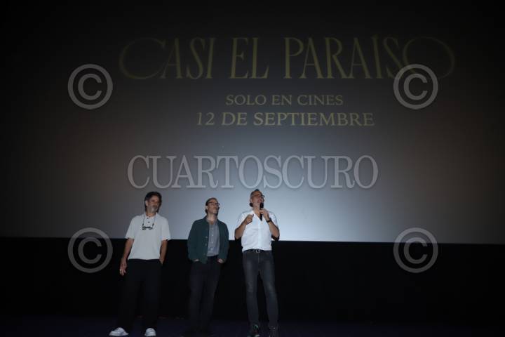 CIUDAD DE MÉXICO, 08MAYO2024. El actor Miguel Rodarte, el productor Miguel Rivera y el director Edgar San Juan durante la presentación de los avances de la película “Casi el paraíso”, en un cine al sur de la Ciudad de México. FOTO: EDGAR NEGRETE LIRA/CUARTOSCURO.COM
