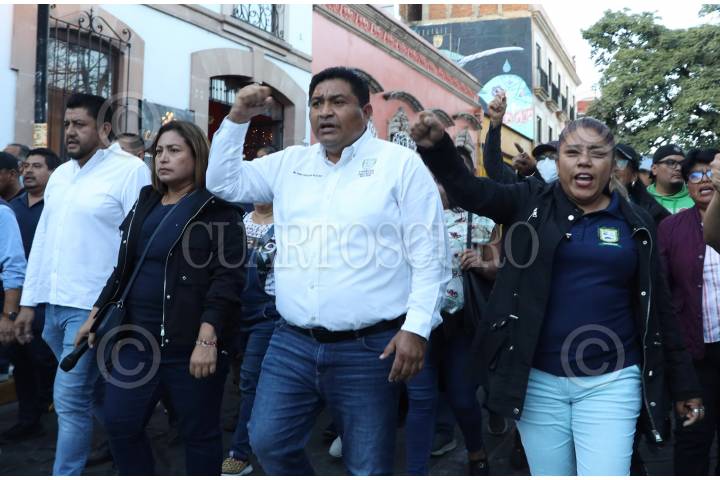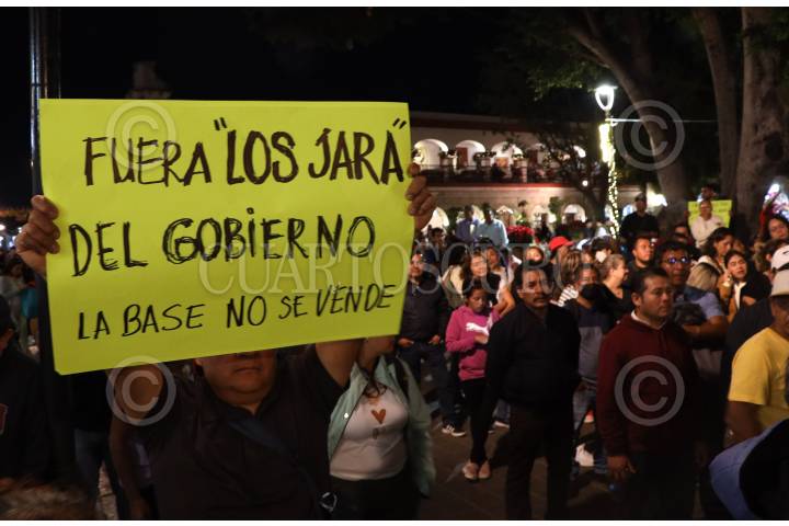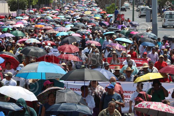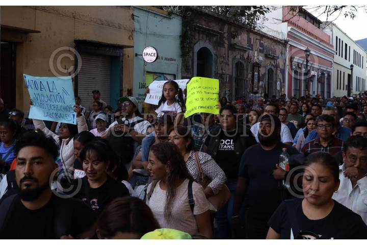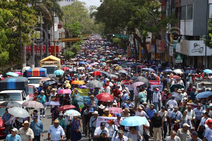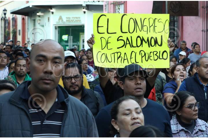 OAXACA DE JUÁREZ, OAXACA, 13DICIEMBRE2024.- Miles de agremiados al Sindicato de Trabajadores de los Poderes del Estado e Instituciones Descentralizadas de Carácter Estatal de Oaxaca (STPEIDCEO) marcharon hacia el Palacio de Gobierno en la capital del estado para exigir la derogación del decreto aprobado por el Congreso Local de la iniciativa enviada, por el gobierno del estado del morenista Salomón Jara Cruz, para la desaparición de mil 344 plazas. Los trabajadores denunciaron que la medida es arbitraria, ya que no están claros los criterios que se usaron para determinar dicha acción además de dejar en indefensión a personal que lleva hasta 30 años laborando. FOTO: CAROLINA JIMÉNEZ/CUARTOSCURO.COM