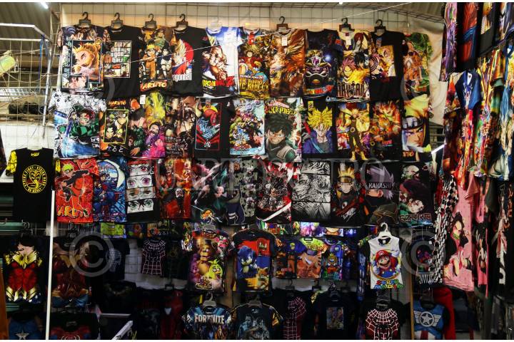 Decenas de camisetas con estampado de comics japonés a la venta en la Plaza Lido en el centro de la ciudad.