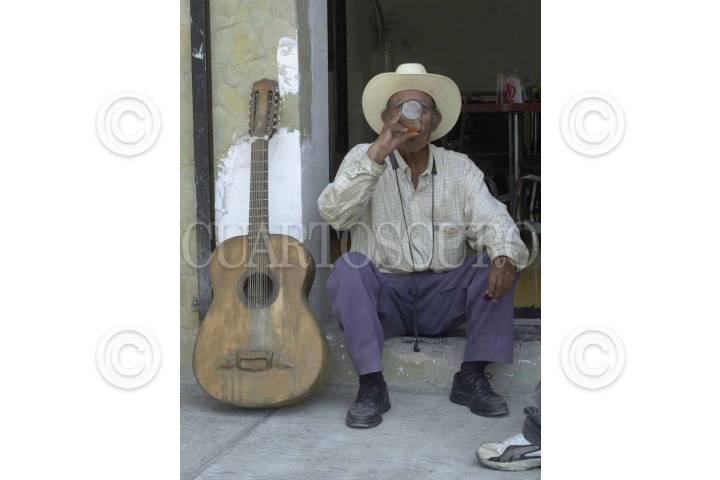 MONTERREY, NUEVO LEON 16SEPTIEMBRE2004.- Después de recorrer la ciudad por parques y jardines, ofreciendo sus canciones a 5 pesos Don Juan Treviño Cantú, se toma un descanso y un refresco, frente a la Macroplaza. FOTO: Antonio Ruvalcaba/CUARTOSCURO.COM