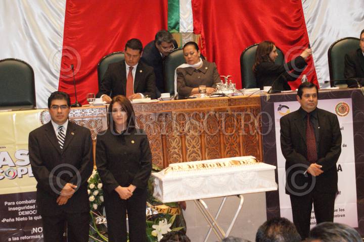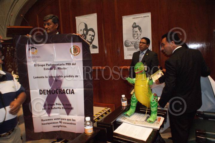 TOLUCA, ESTADO DE MÉXICO, 14SEPTIEMBRE2010.- Diputados del Partido de la Revolución Democrática (PRD) y del Partido Acción Nacional (PAN), en el Congreso del Estado de México, encabezaron una protesta en el salón de plenos mostrando así su inconformidad respecto a la iniciativa del Partido Revolucionario Institucional (PRI), para la extinción de las candidaturas comunes en el Congreso local. FOTO: JAIME ARRIAGA/CUARTOSCURO.COM