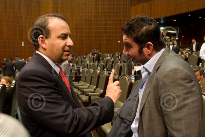 MÉXICO, D.F., 23SEPTIEMBRE2010.- Alfonso Navarrete Prida, Diputado del PRI y Jorge Kahwgi, Diputado de Nueva Alianza, durante la sesión en la Cámara de Diputados. FOTO: GUILLERMO PEREA/CUARTOSCURO.COM