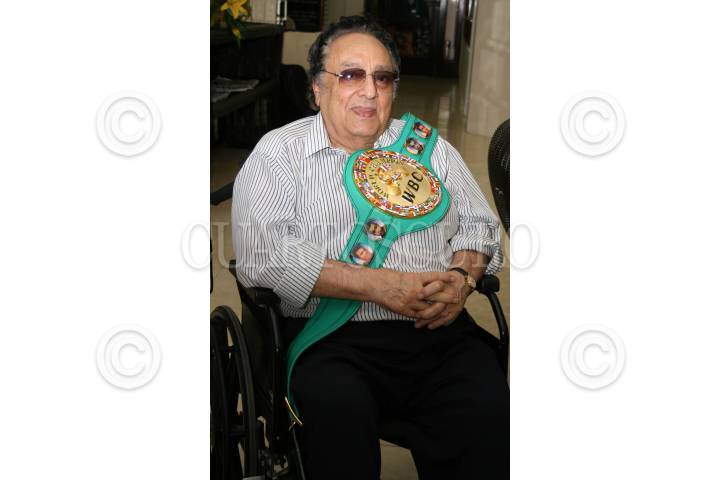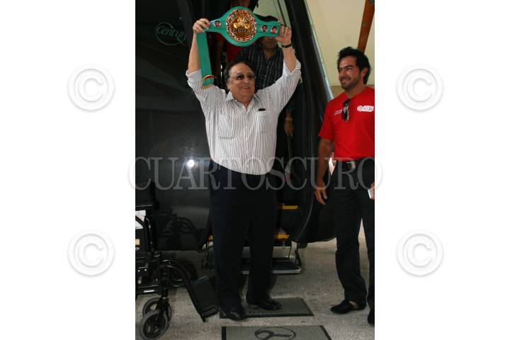 CHETUMAL, QUINTANA ROO, 27MAYO2008.- El Presidente del Consejo Mundial de Boxeo José Sulaiman Chagnón pone hasta arriba el cinturon con el que se pone en juego el campeonato mundial de peso plumada, lo cual es observado por el promotor boxistico Pepe Gomez. FOTO: MARCO POLO GUZMÁN HERNÁNDEZ/CUARTOSCURO.COM