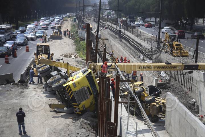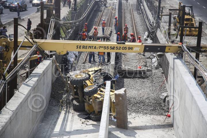 MÉXICO, D.F., 29JULIO2015.- Una volcadura de una pluma industrial y un traxcabo se volcaron al interior de las vías del metro férreo entre las estaciones Peñon Viejo y Guelatao de la linea A donde se realiza la renivelación de las vías del metro. FOTO: SAÚL LÓPEZ