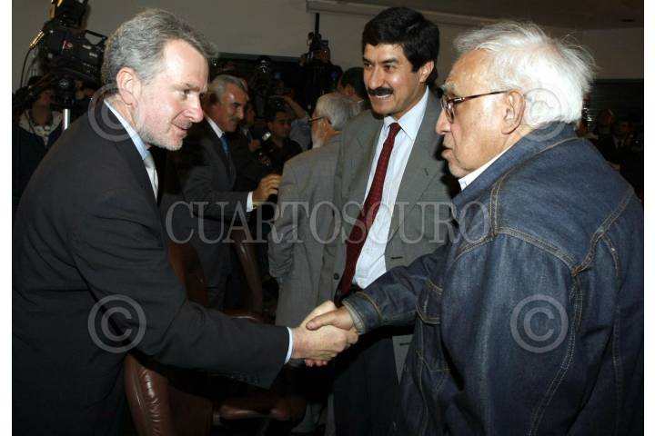 MÉXICO D.F.,20FEBRER02008.- El presidente de la Mesa Directiva del Senado de la República, Santiago Creel Miranda saluda a Carlos Monsivaes, durante la reunión del Grupo Plural con el Frente Nacional por la Reforma de los Medios. FOTO: IGNACIO GONZALEZ/CUARTOSCURO.COM
