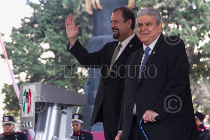 CIUDAD DE MÉXICO, 19OCTUBRE2016.- Manuel Humberto Cota Jiménez, líder de la CNC, y Carlos Aceves del Olmo, líder de la CTM, durante el 71 aniversario luctuoso del ex presidente Plutarco Elías Calles, también fundador del PRI, en el Monumento a la Revolución. FOTO: MOISÉS PABLO /CUARTOSCURO.COM
