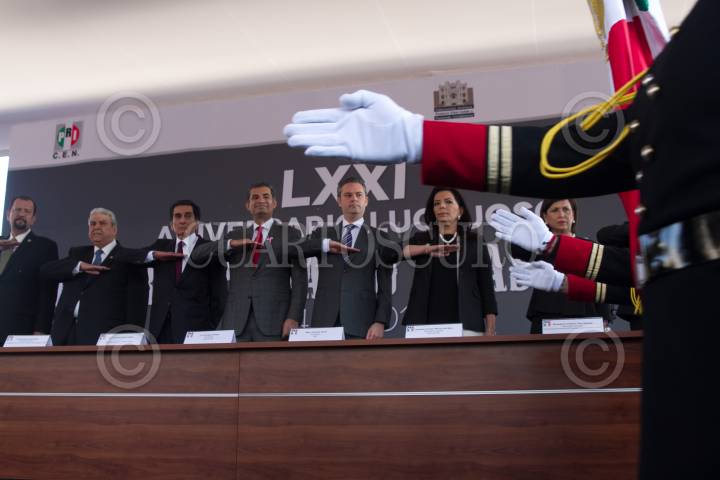 MÉXICO, D.F., 19OCTUBRE2015.- Carolina Monroy del Mazo, secretaria general del PRI, Manlio Fabio Beltrones, presidente nacional tricolor, y Enrique Ochoa Reza, titular de la CFE encabezaron el acto por el 70 aniversario luctuoso del general Plutarco Elías Calles, en la sede nacional del PRI. FOTO: ISAAC ESQUIVEL /CUARTOSCURO.COM