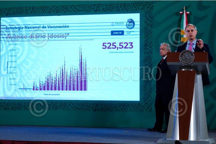 Andrés Manuel López Obrador y Hugo López-Gatell durante la conferencia matutina en Palacio Nacional