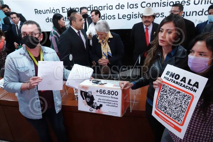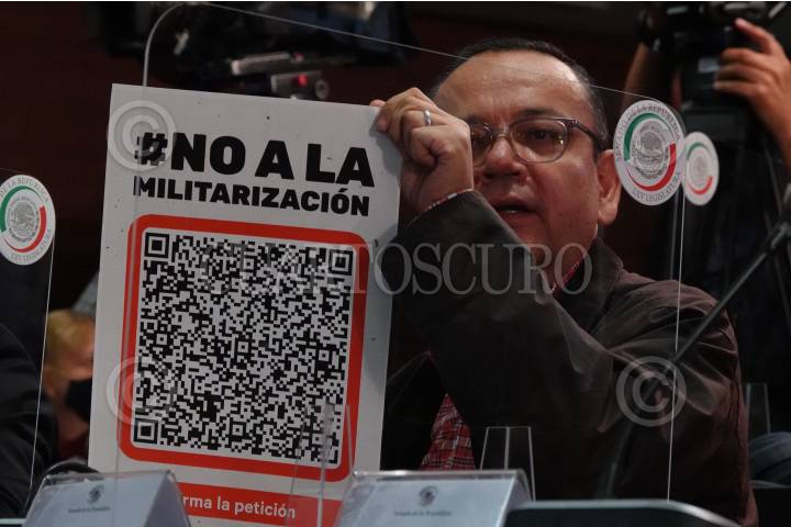 El senador panista Germán Martínez Cázares sostiene un cartel con la leyenda No a la Militarización previo al inicio de la discusión en la Comisión de Justicia del Senado de la República