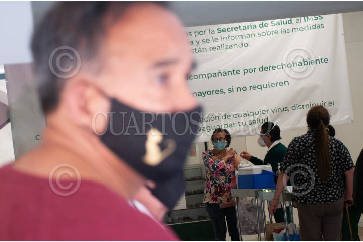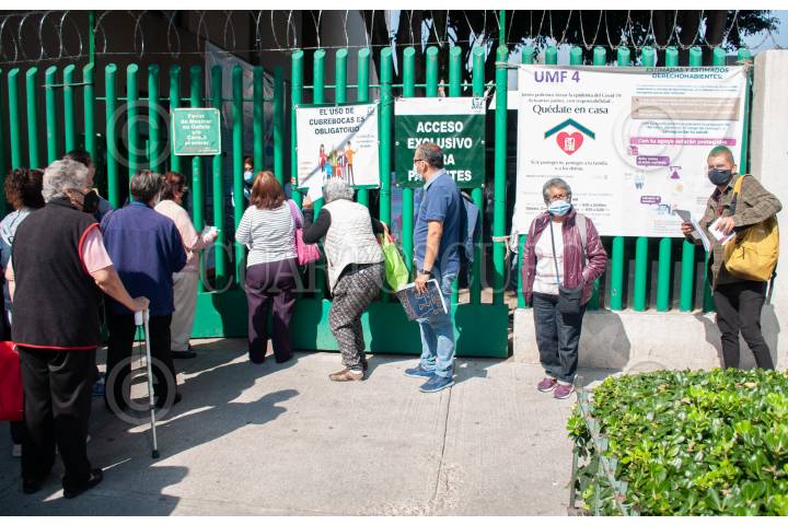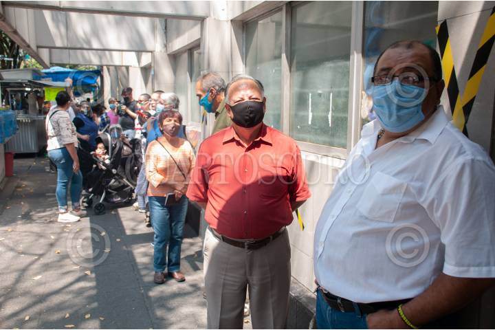 Ciudadanos hacen fila para aplicarse la vacuna de la influenza en las clínicas del IMSS.