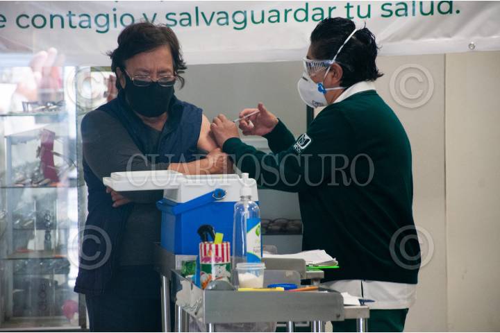 Una mujer mayor de edad se aplica la vacuna contra la influenza en una de las clínicas del IMSS.