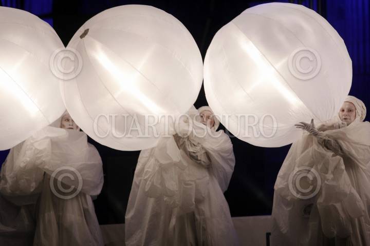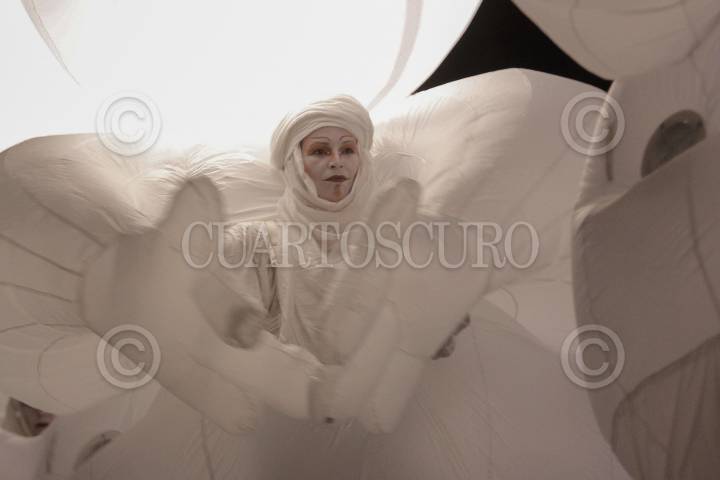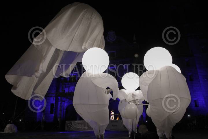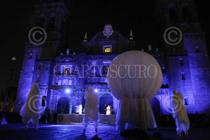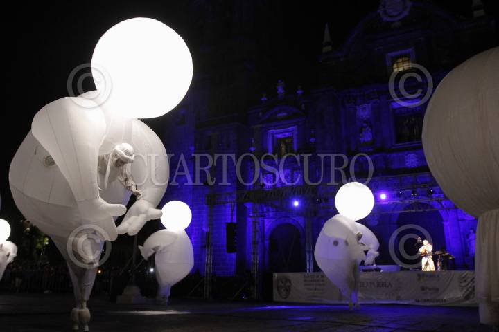 PUEBLA, PUEBLA, 17NOVIEMBRE2013.- La compañía de teatro Coproducción de la Compaigne des Quidams con Inko Nito, presentó el espectáculo "El sueño de Herbert" en el atrio de la catedral poblana, con lo que se inició formalmente, la noche de ayer, el tercer Festival Internacional de Teatro Héctor Azar Puebla 2013, a realizarse del 15 al 23 de noviembre. FOTO: HILDA RÍOS/ CUARTOSCURO.COM