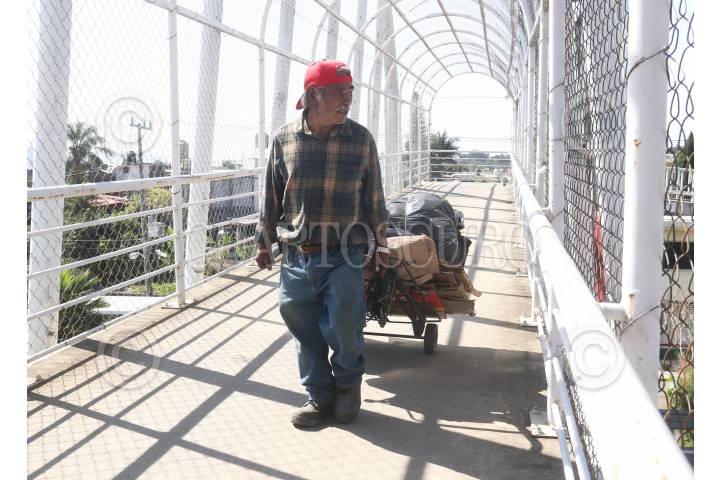 CUERNAVACA, MORELOS, 13NOVIEMBRE2024.- Vida cotidiana en la capital de Morelos, un hombre de la tercera edad cruza por un puente peatonal del paso exprés, arrastra su diablo con material de reciclar. FOTO: MARGARITO PÉREZ RETANA/CUARTOSCURO.COM