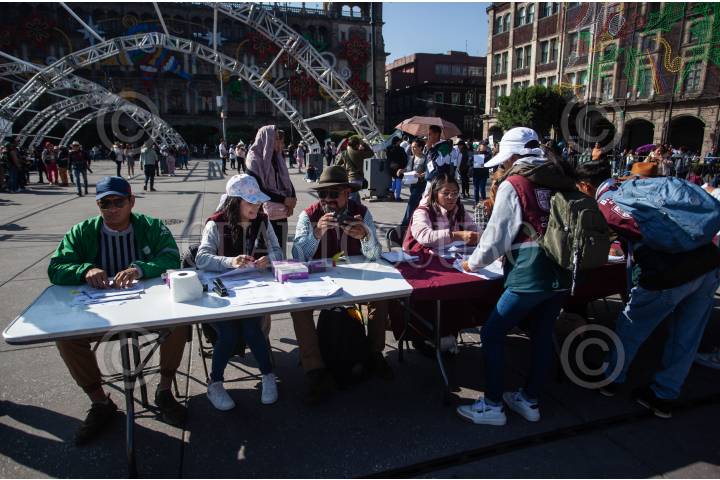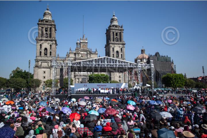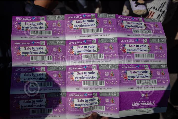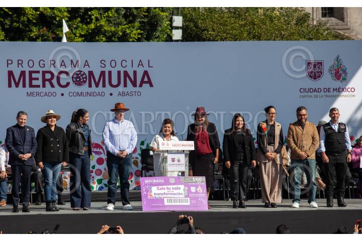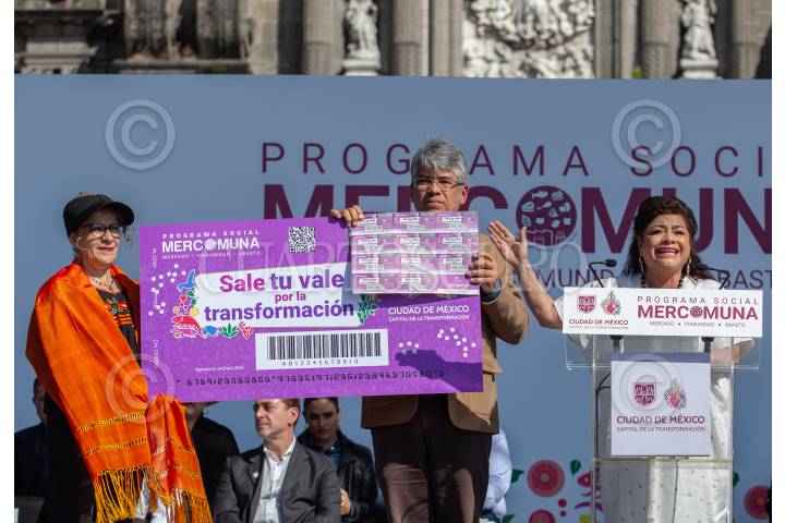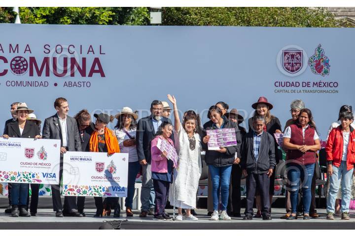 CIUDAD DE MÉXICO, 11DICIEMBRE2024.- Clara Brugada, jefa de Gobierno de la Ciudad encabezó la entrega del programa Mercomuna (Mercado, comunidad y abasto) que se llevó a cabo en la Plaza de la Constitución y consiste en tener vales para comprar con locatarios de las alcaldías de la ciudad registrados en el programa. FOTO: ANDREA MURCIA /CUARTOSCURO.COM