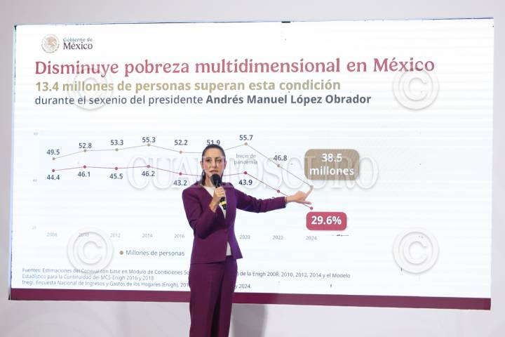 CIUDAD DE MÉXICO, 14AGOSTO2025.- Claudia Sheinbaum, presidenta de México, presentó esta mañana durante la conferencia del pueblo, las cifras publicadas por el INEGI el día de ayer donde anunciaron que más de 13 millones de personas abandonaron la pobreza durante el sexenio de Andrés Manuel López Obrador. FOTO: DANIEL AUGUSTO/ CUARTOSCURO.COM