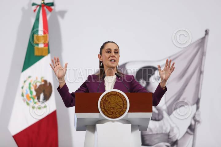 CIUDAD DE MÉXICO, 14AGOSTO2025.- La presidenta de México, Claudia Sheinbaum, durante la conferencia del pueblo de este jueves en Palacio Nacional, donde respondió las preguntas de la prensa luego de presentar los avances en turismo y la reducción de pobreza en México. FOTO: DANIEL AUGUSTO/ CUARTOSCURO.COM