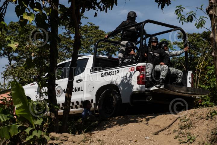 Elementos de la Guardia Nacional durante un recorrido por la zona afectada por la violencia en el municipio.